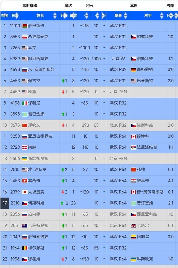 WTA排名前十的最新变化包括,萨巴伦卡继续领跑,斯瓦泰克紧随其后,高芙守住第三。 第四至第十位依次为阿尼西莫娃、佩古拉、安德列娃、莱巴金娜、萨姆索诺娃、泡里尼和凯斯。 郑钦文跌至第十一位,与第十名的凯斯相差35分。