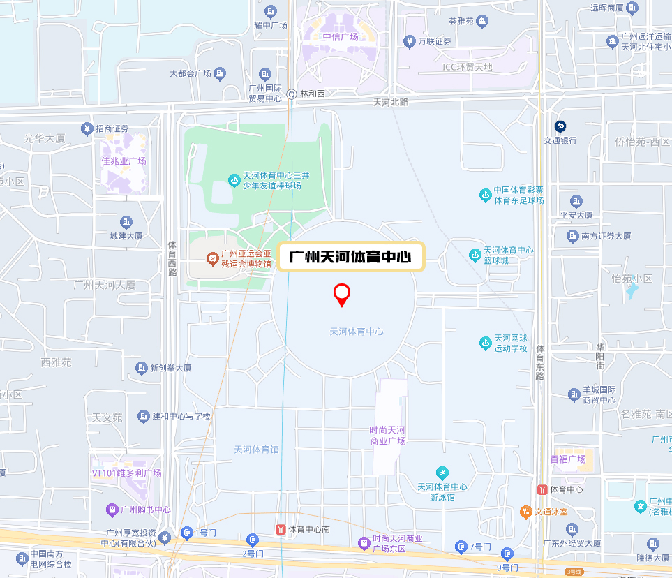 广州天河体育中心位于广州市天河路299号,始建于1984年,始建于1984年,曾承办六运会、九运会和亚运会等重要赛事,是广州乃至全国的重要体育符号;这也是首个由中国人自行设计建造的综合性体育中心,开创了同时建成体育场、体育馆、游泳馆三大场馆的先河。体育中心总占地面积52万平方米,地处广州市金融商业中心地带,毗邻广州东站,与中信广场相对,是中国首个5G智慧球场,也是广州举办大型综合性运动会的首选之地、最主要的群众健身运动场所、六运会开闭幕式主会场、九运会赛场、广州亚组委总部所在地。广州天河体育中心以 一场两馆 为核心,辅以10余类配套设施,形成了中国首个一次性建成的大型综合体育中心。由于天河体育中心位于城市新中轴线上,见证了广州城市的飞跃发展,对于广州的意义不仅在体育运动本身,也是城市发展史的一部分,是能体现城市内涵与特色的城市地标。