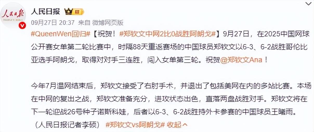 在9月27日的比赛中,郑钦文直落两盘,以2-0的比分战胜对手,强势回归。《人民日报》也专门发文祝贺:“Queen Wen(文女王)归来!”