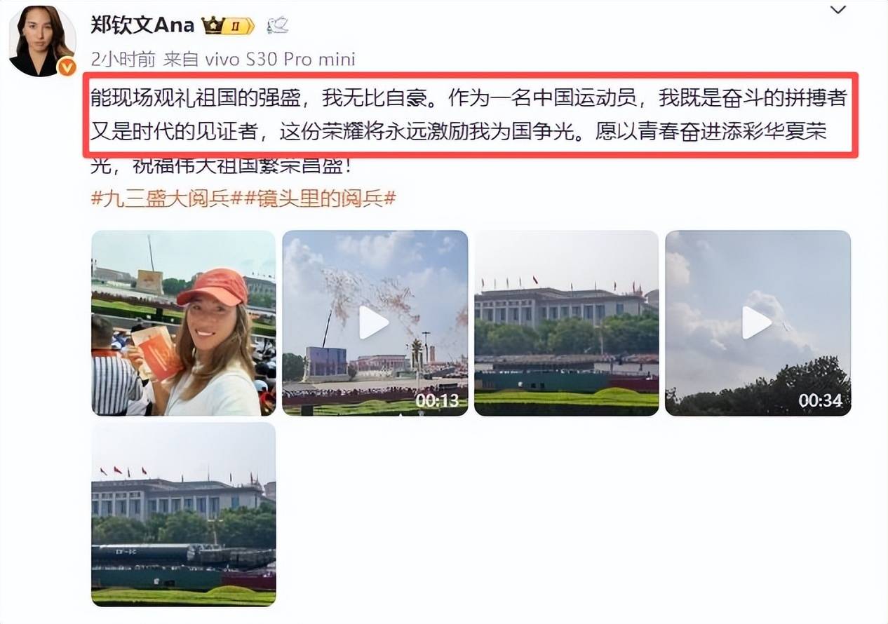 她因此获邀观礼阅兵,可谓当之无愧。仪式后,郑钦文心潮澎湃地分享道:“亲眼目睹祖国的昌盛与强大,我内心充满了无限的荣耀与自豪。”